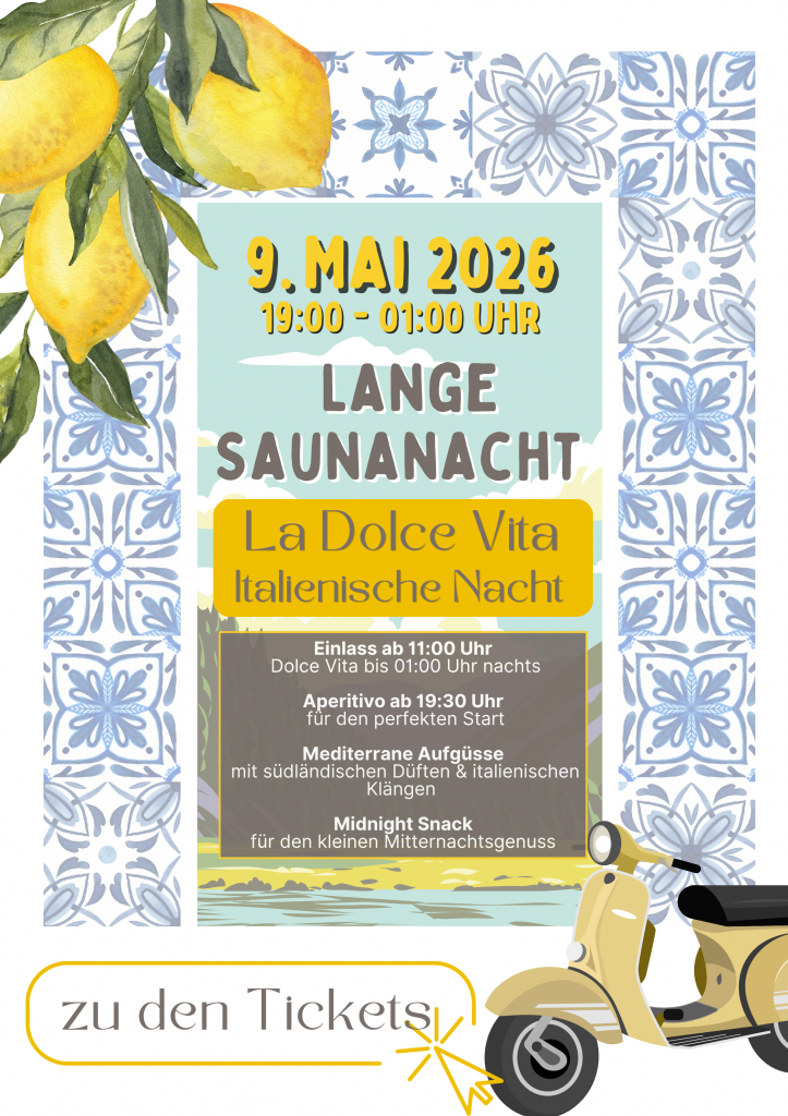 Ein besonderes Highlight sind unsere beliebten Langen Saunanächte als Themen-Events, bei denen die Medi Therme bis 01:00 Uhr nachts geöffnet bleibt. Freuen Sie sich auf besondere Aufgüsse, stimmungsvolle Atmosphäre und einen unvergesslichen Saunaabend.