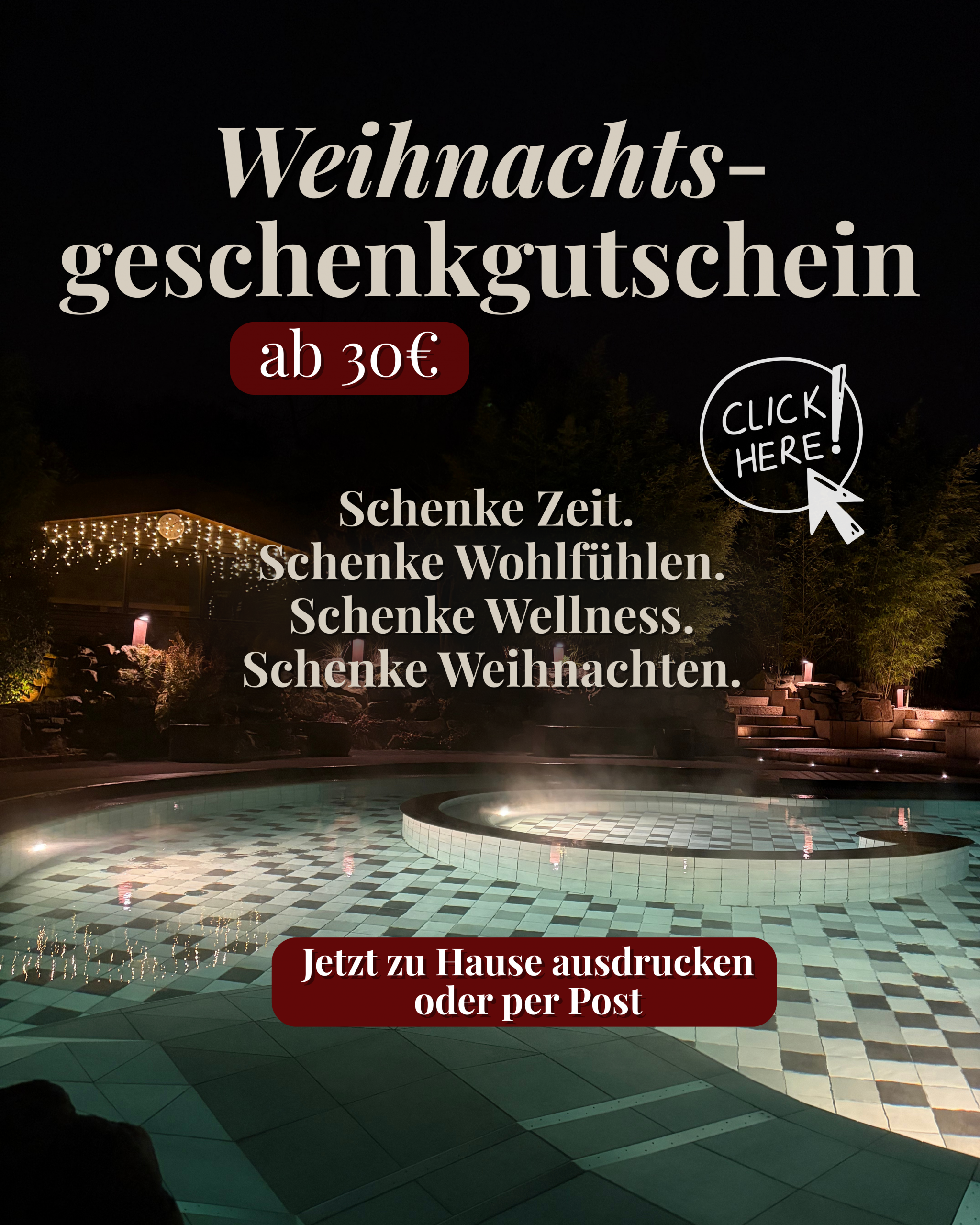 - Nutzung der kompletten Thermenlandschaft inklusive Solebecken (1 Stunde täglich)